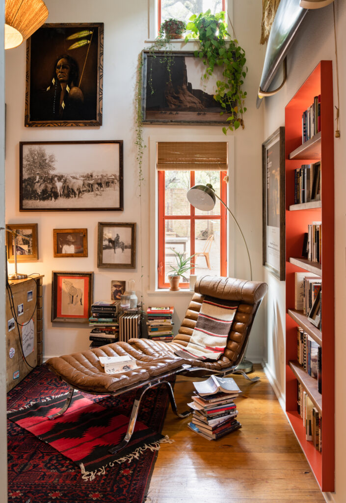 Once the dining room was finished, he decided to update the front door and all of the office windows to match the orange-vermilion steel aesthetic. He also repurposed a door leading to the driveway, transforming it into a steel bookshelf and creating space for a leather chair he’d been saving.