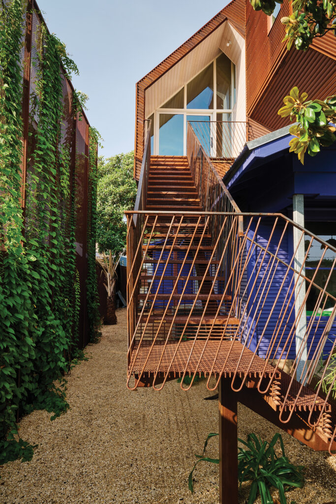 The Perch is cantilevered, appearing to hover on one angle of the bungalow’s roof, with a stiff steel skeleton above and wood shear walls in the house below acting together to resist lateral wind forces. “The cantilevers and vibration control [for things like footsteps on the exterior stairs] are always trickiest when you have longer steel spans with shallow beam depths and relatively low mass,” Stoltz says. “There is a healthy collaborative tension we have with Nicole where we often start with something verging on impossible that forces us to think outside the box and use tools and materials in unique ways”
