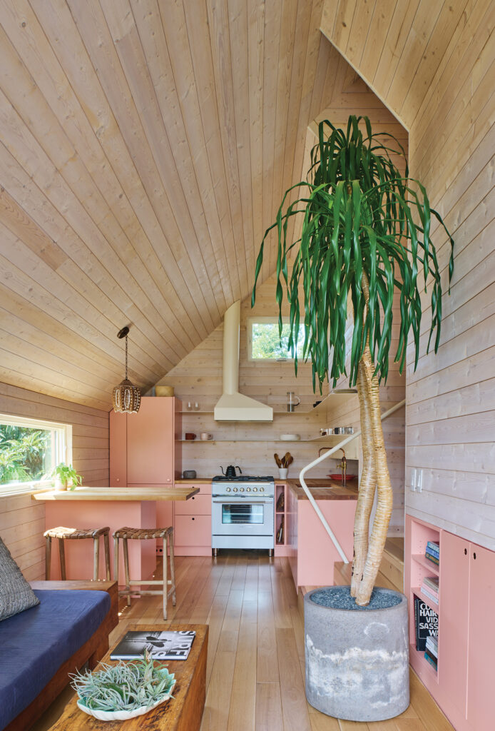 The serene, minimalist interior, also designed by Blair, is similarly economical and durable, with insulated glass windows and walls and ceiling paneled with prefinished T&G whitewashed pine from Woodtone. The kitchen’s off-the-shelf maple Boos butcher block countertops also complement the distinctive peony-hued Ikea cabinets (Behr’s California Coral), which were outfitted with custom fronts and assembled and installed by Alex Geller of APlus Cabinetry. Geller also did the hall storage cabinet, which received a coat of Sherwin William’s Persimmon.