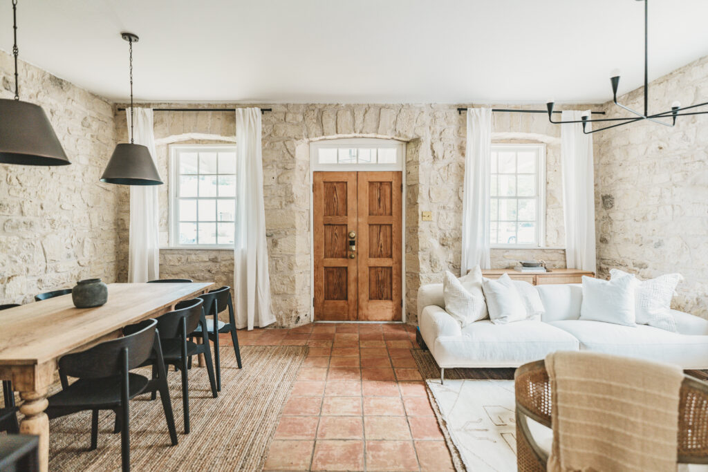 Sunday Haus consists of three spaces: the main house; the historic home; dubbed the Stone Haus; and two new dwellings, the Ranch Haus and the Cottage. The Stone Haus, built in 1861, underwent extensive renovations to fit what Ko calls the Texas-chic-meets-luxury aesthetic of Sunday Haus, but it still maintains the original home’s historical aspects, such as the flooring, brickwork, and windows.