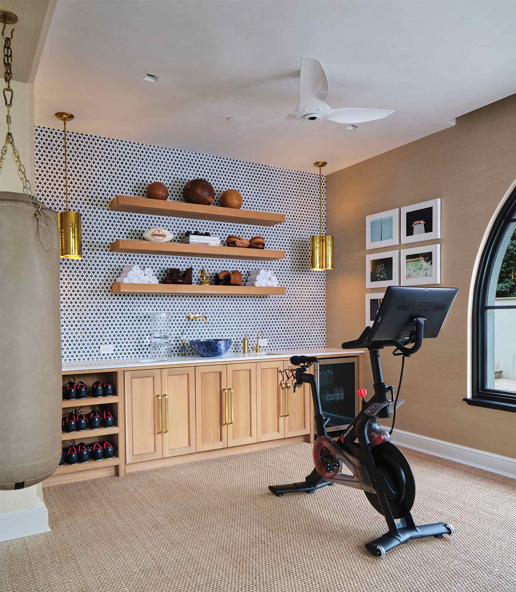 Because of the slope of the land, a portion of the basement is at ground-level, affording stellar views from the state-of-the-art exercise room equipped with a Reformer, a Peloton, and a custom boxing bag.