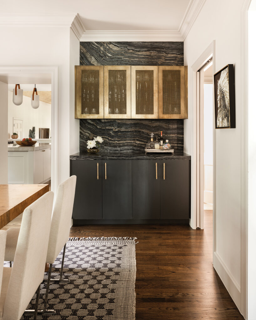“We wanted to create a little bit of drama in the adult spaces,” says Burke. The bronze mesh cabinets in the custom bar were fabricated by Hewn Austin (no longer around) and designed by Burke to showcase the client’s crystal collection. The black and bronze details mirror the drama created in the foyer through custom Calico wallpaper with gold drips. “When you first come into the home, I’m kind of setting the tone for that more formal space. It sets a mood without it being overwhelmingly dramatic,” she says.
