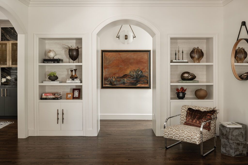 The hallway to the bedrooms originally began in the foyer. Burke closed off that original corridor to create a more impactful statement upon entry. This new archway opens off the formal living room and displays additional objects and a minimal selection of books. The updated floorplan also allotted space to add a powder bath nestled behind the foyer wall.