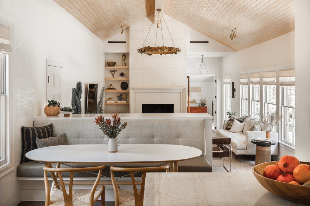 The family room saw the largest transformation. The dining nook preceded the renovations, but Burke built out a banquette with durable, washable fabrics and removed the dividing wall, airing out the space into a great room. When the contractors opened the low ceiling line, they found a single structural beam which remains, and vaulted the roofline with bright wood-paneling. The room also features a tactile, ceramic, mesh wall hanging commissioned by artist Taylor Kibby. “This went from being the worst room in the house to a space you just really love hanging out in,” Burke says.