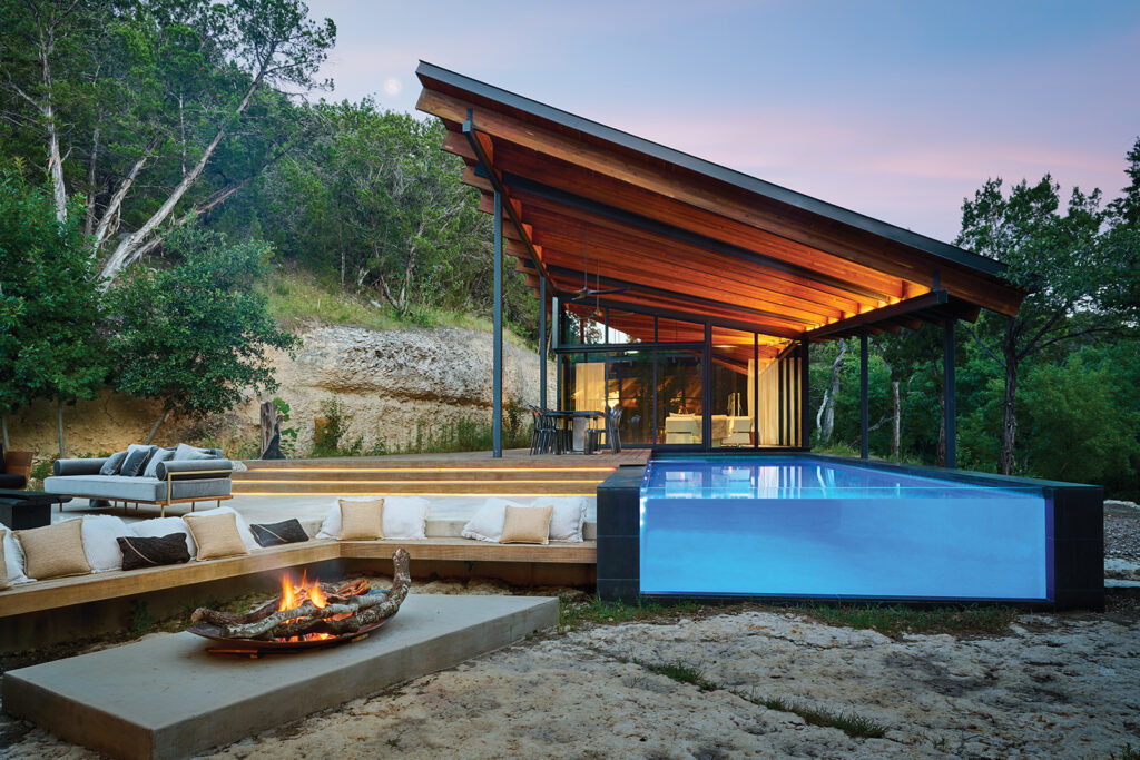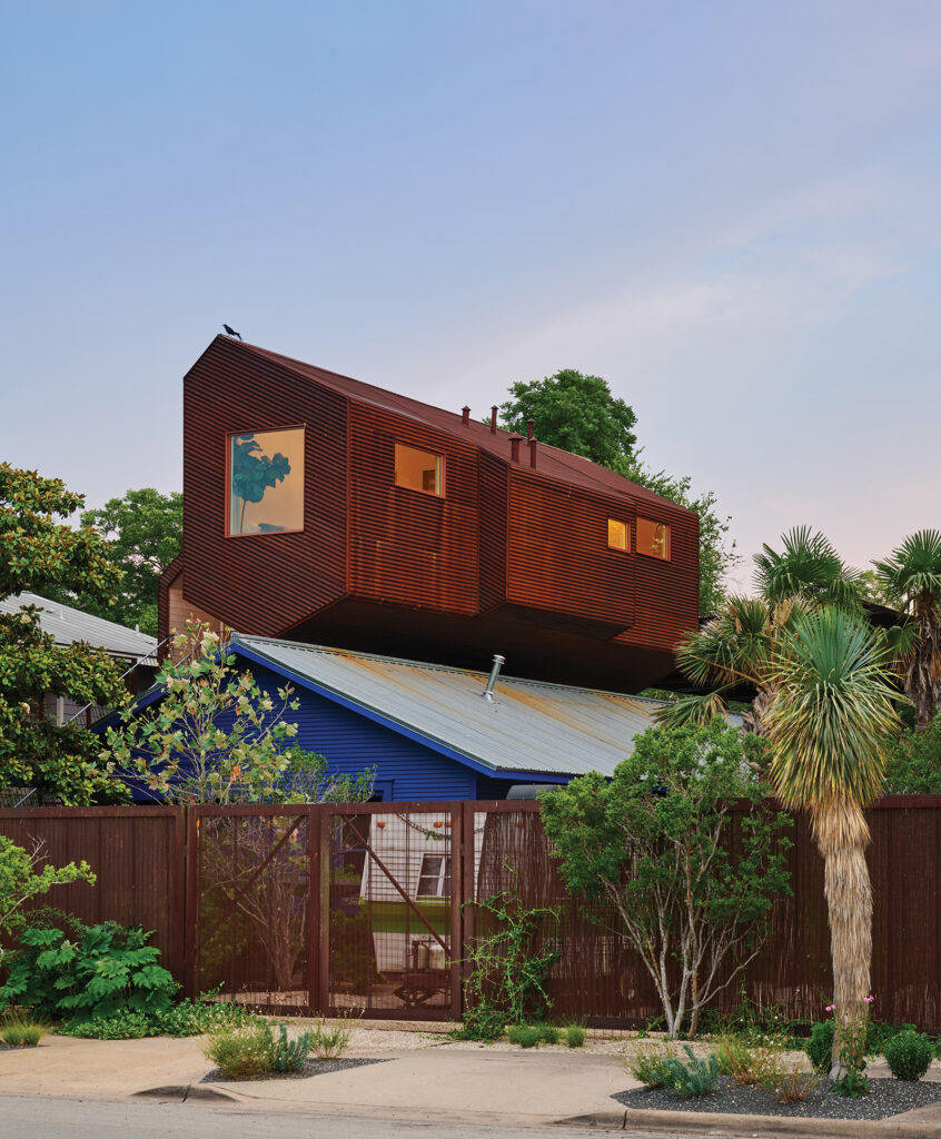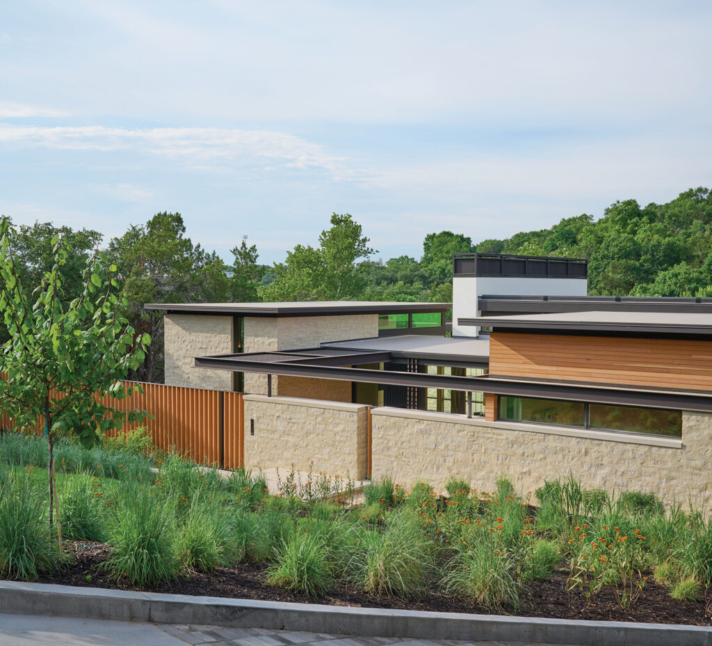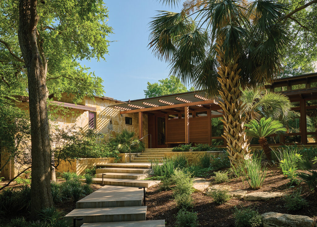 In the heart of the Zilker neighborhood, a deep, narrow site culminates in a 35-foot drop into a wide urban stream, setting the stage for this unique residence. The home consists of a guest apartment over a carport (learn more on page 42), a welcoming forecourt space, and the main residence, where private bedrooms on the main and lower levels, a small spa/plunge pool, and a screened porch all have access to stream views and allow residents to immerse themselves in their surroundings.