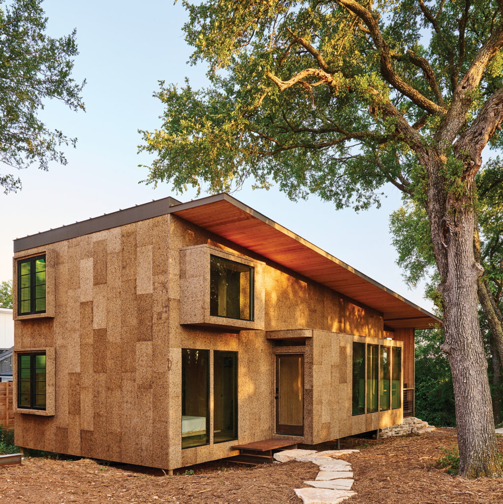 As part of a multi-year research and design process, homeowner Greg Esparza, in collaboration with Moontower design firm, created a studio for his family to explore what happens if the climate is put first when designing a home. The two-bed, two-bath home is built entirely from plant-based materials that include cross-laminated timber panels and thermally modified cork, resulting in zero carbon emissions. See what a home can be with no concrete above grade, no gypsum wallboard, no petroleum-based insulation, and no cementitious siding, stucco, or mortar.