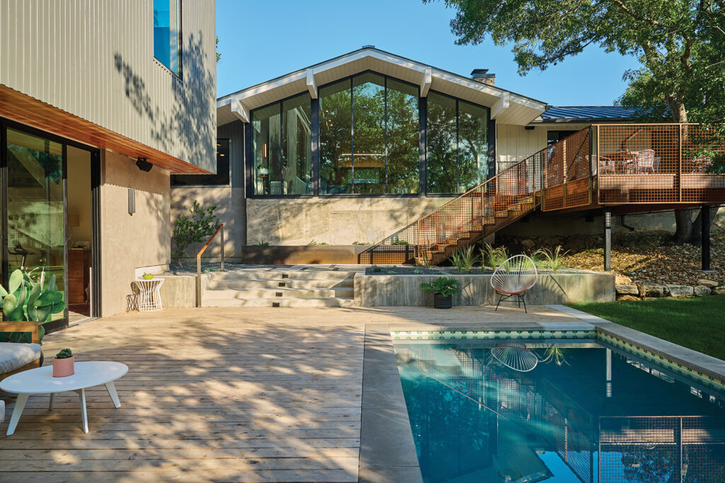 Located in West Lake Hills, the residence is an intriguing renovation and addition project. The existing midcentury house has been carefully renovated, seamlessly integrating a two-story addition that features a primary suite and a second living space. Working in harmony, the new addition and original house frame the charming backyard, creating an intimate oasis around a newly constructed pool. Sustainability is central to the design. The addition’s roof efficiently channels all water to a single collection point, while solar panels are situated on the south-facing roofs to harness renewable energy.