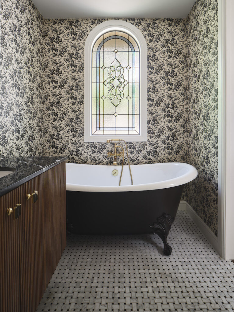 The bathrooms are the star of the entire house. “I wanted the bathrooms to have a wow factor,” Clark explains. “When I saw the black claw foot tub, I knew I wanted a black and white bathroom.” The bathtub, located in the ground floor’s full bath, paired perfectly with the raised gold and abstract pattern of the Gucci Herbarium print wallpaper, Nero Marquina marble counter, and the Bedrosians’ Aurora basketweave marble tile floor. The lone window is a stunner—half-round stained glass designed and installed by Scottish Stained Glass.