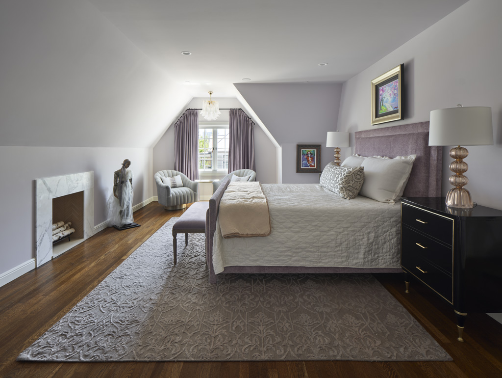 The primary bedroom features purple accents in the furnishings—a velvet king-size bed along with a linen bench and curtains from Restoration Hardware—while the walls are painted Violet Pearl from Sherwin Williams. The same paint color was used in the jaw-dropping primary bath. A half-round stained glass window is perfectly centered in a geometric roof gable alcove above a white freestanding bathtub. The glass-enclosed corner shower is lined with Calacatta Lilac marble. To avoid overpowering the bath with purple, the counters are Namibian White and a white-honed marble (Hawthorne White) was used for the floors. The purple accents continue in the living room. The floor also includes Clark’s daughter’s playroom with Disney characters painted by local artist Merrilee McGehee.