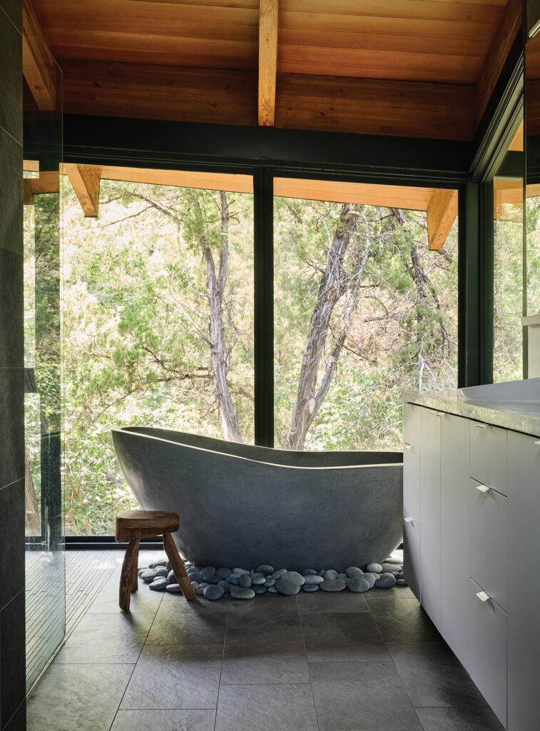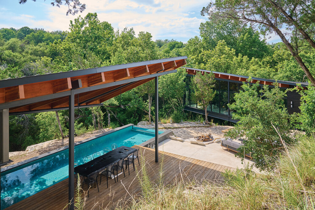 Located just outside downtown Austin, the Falling Leaves house feels worlds away, thanks to the meticulous attention given to each step of the planning, designing, and building process. Others may not have had the patience to see the multiyear project through, but for Mandel, it felt like a calling. “I firmly believe that the land found me,” she says. During the process, she and her husband launched the Olympus Foundation, which is dedicated to restoring and beautifying the greenbelt on which they live. “It was important for us to be as light on the land as possible,” she says. “We didn’t want to destroy it; we wanted to heal it and make it thrive.”
