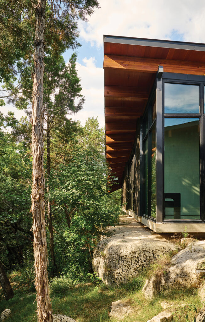 The ideal position turned out to be a limestone shelf perched 20 feet above a creek and located more than a quarter mile from the nearest road. Before taking any steps, the couple brought in a series of consultants—including the Lady Bird Johnson Wildflower Center and faculty from the University of Texas School of Architecture—to survey the property and help develop a building plan that would least disturb the existing landscape and wildlife. “We spent two years getting rid of invasive species, restoring and re-vegetating the land with native species, and clearing brush,” Mandel recalls.